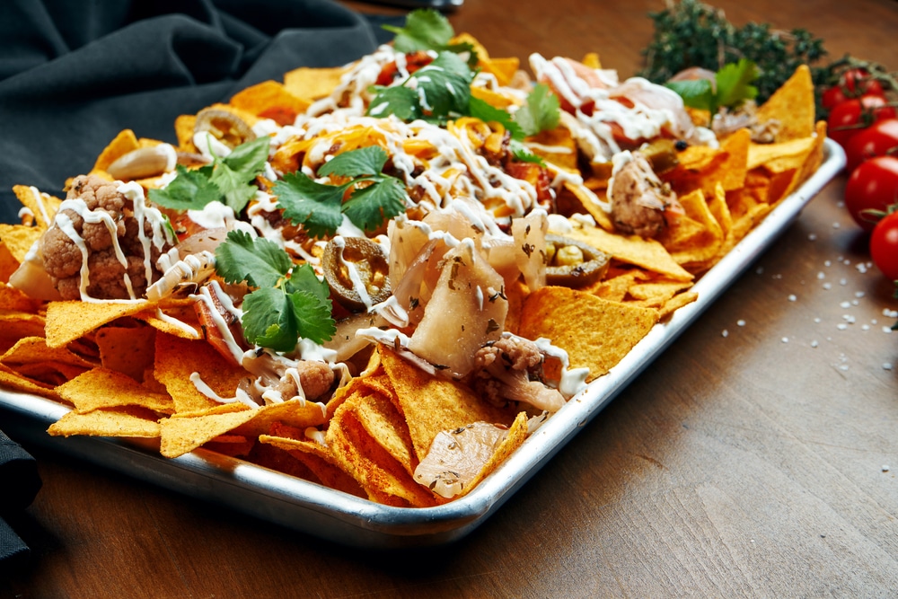 Tortilla chips piled high with queso, jalapeños, and seasoned beef.
