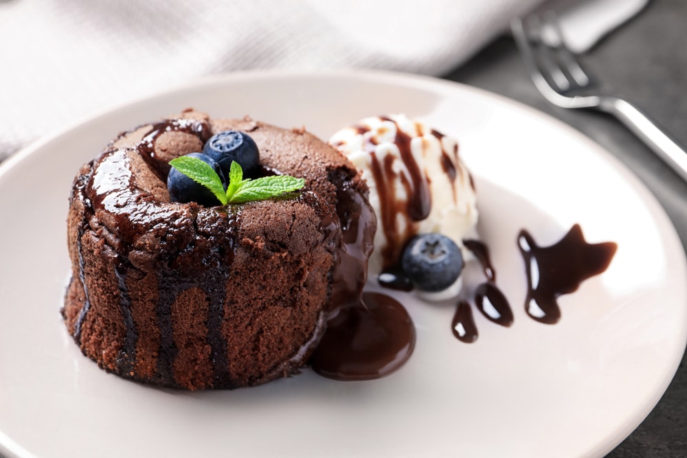 Warm chocolate cake with a gooey center, topped with vanilla ice cream and fudge drizzle.