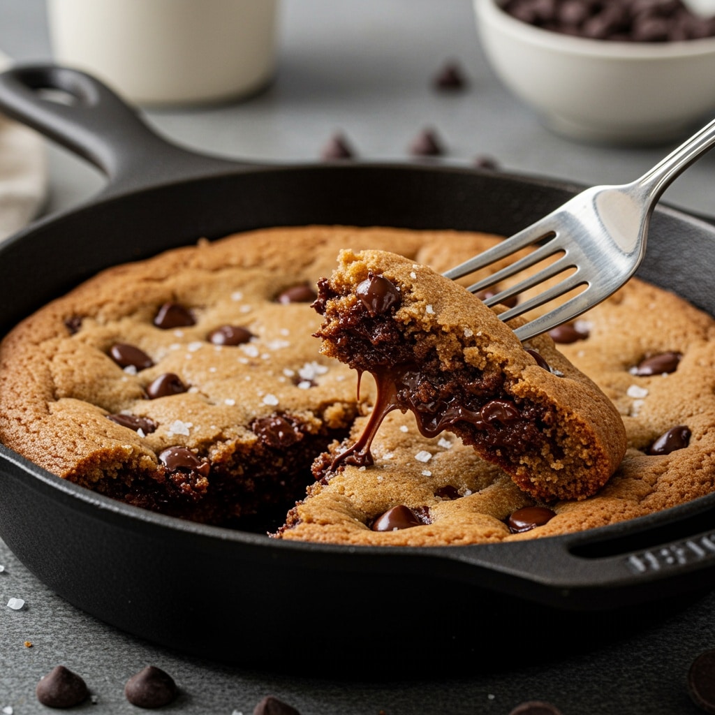 Giant chocolate chip cookie served warm in a skillet with a scoop of vanilla ice cream.